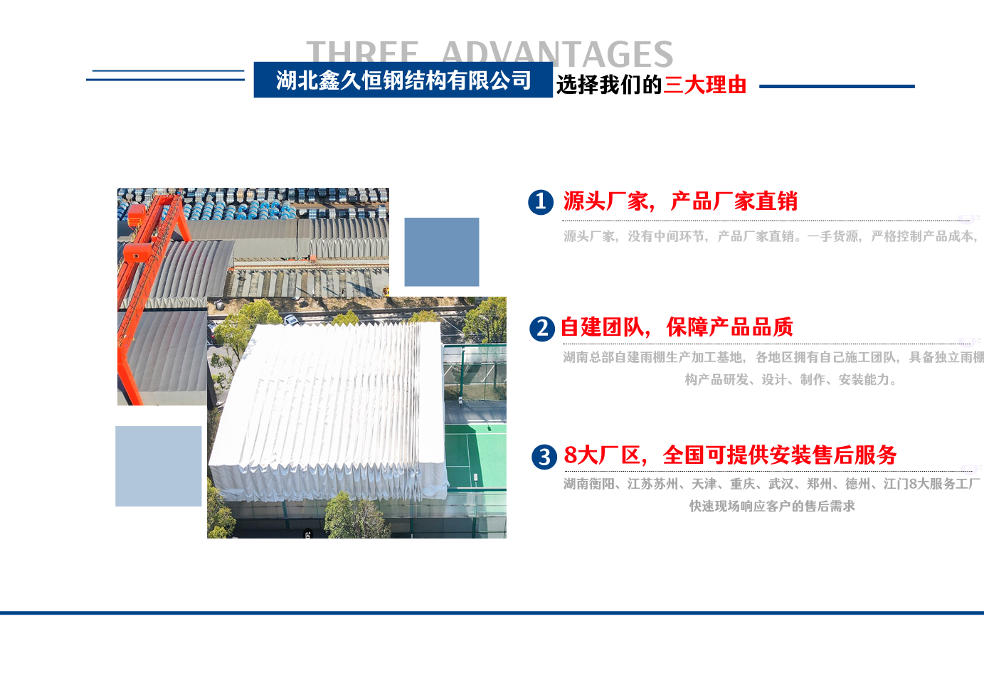 湖北鑫久恒鋼結構有限公司是一家電動雨棚、膜結構車棚研發,生產銷售,施工安裝于一體的專業鋼結構科技公司,主要產品有伸縮雨棚,電動雨棚,膜結構車棚等。  湖南地區職員目前有80多人,占地面積20000平方米,廠房面積15600平方米,配備先進的生產流水線,使每件品質產品的堅實基礎。  公司在蘇州、天津、重慶、武漢、德州、烏魯木齊、江門均設有服務工廠,總人員共300多人,擁有專業的技術團隊,配備先進的設備和流水線生產,產能高,貨源充足,發貨速度快,服務區域廣。  移動伸縮棚適用于通道臨時倉儲、戶外運動遮陽、污水池遮蓋、能源交通、熱力化工、礦山、船舶制造及市政建設、物流、碼頭等領域的構件制作加工,成品半成品存放、倉庫、野外儀器設備操作用房等。尤其是對工廠發貨、倉儲臨時遮雨防嗮,梅雨期較長、建設周期較短的工程施工等特別適用。還可根據用戶需求量身定制、適合企業所需不同款式的產品。  我公司堅持“誠信社會為本,客戶滿意為榮”的經營理念,做到質量把控,嚴格管理,精益求精,恪守承諾。使鑫久恒逐步走向成熟,其系統化、專業化日趨完善。以專業的技術、科學的管理,更高的產品質量,優良的企業信譽,真誠的客戶服務,靈活多樣的經營方式和務實創新的企業精神愿與社會各界攜手合作,為推動智能鋼結構建筑事業的發展而不斷努力。...